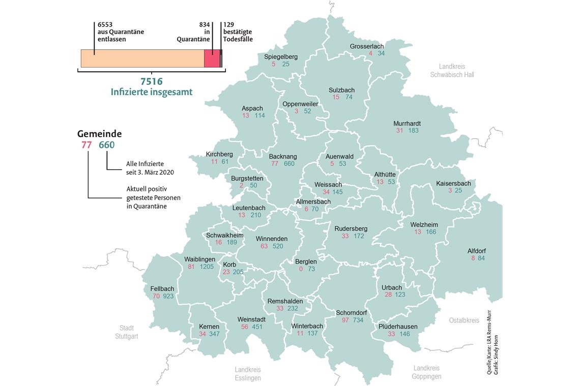 Warum sich nun ausgerechnet der Rems-Murr-Kreis zu einem Hotspot zu entwickeln scheint, ist schwer zu sagen. Es gab – zumindest soweit das Landratsamt weiß – keine Superspreading-Events, es ist auch keine bestimmte Personengruppe, die die Infektionen in die Höhe treibt. Zwar habe es in Einrichtungen wie zum Beispiel der Diakonie Stetten immer wieder Infektionsherde gegeben, aber das liege daran, dass viele Menschen auf engem Raum zusammenleben.