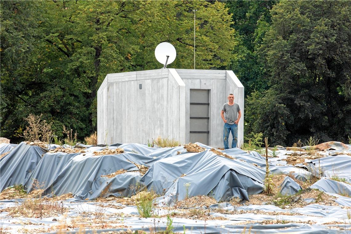 BACKNANG. Auf der Oberen Walke in Backnang konnten die Passanten in dieser Woche Bauarbeiten beobachten. Geht es jetzt voran mit der Umsetzung der neuesten Pläne für dieses Areal? Immerhin sollen dort künftig rund 400 Wohnungen, ein Pflegeheim und ein Ärztehaus stehen und irgendwann einmal rund 1000 Menschen in neue Häuser einziehen. Sollte jemand solche Überlegungen angestellt haben, dem sei gesagt: Mit dem Konzept der Stadt und der Dibag Industriebau AG aus München, der das Gelände gehört, hat der Neubau auf der Industriebrache direkt am Murrufer rein gar nichts zu tun. Das wie ein Betonbunker anmutende Bauwerk ist die Station-P von Dirk Schlichting, der Beitrag des in Herne lebenden Künstlers und der Stadt Backnang zur Kunstaktion der Kulturregion Stuttgart mit dem Titel „Unter Beobachtung – Kunst des Rückzugs“ vom 25. September bis 18. Oktober.