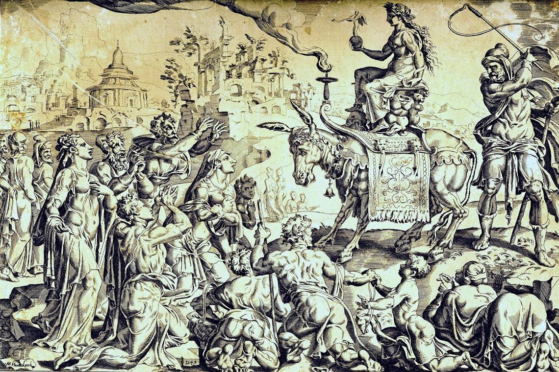 Maarten van Heemskercks Kupferstich „Anbetung eines Idols der Isis“ ist 1549 entstanden. Grafik: Dirck Volkertszoon Coornhert (nach Maarten van Heemskerck)