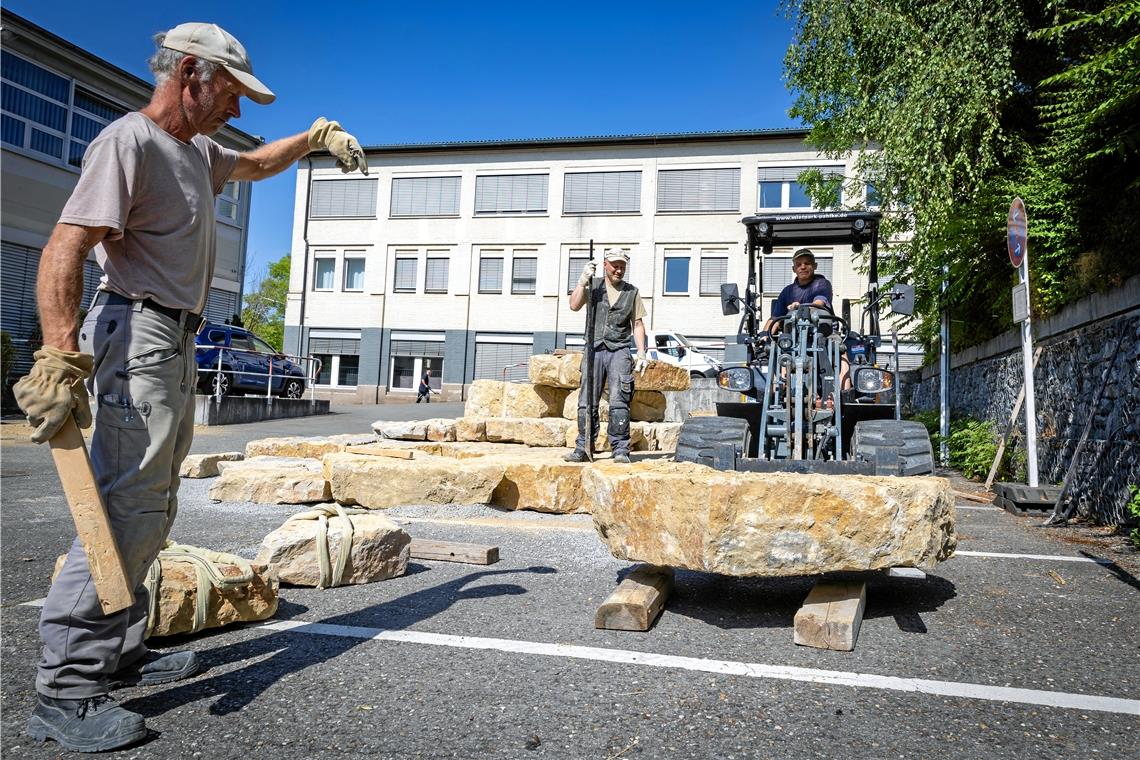 Als Erstes positionieren Norbert Kempf (von links), Tim Maertens und Andreas Rohrbach die Steine mit dem Radlader so, dass die Skulptur die gewünschte Grundform annimmt. Der Vierte im Bunde, Gregor Oehmann, ist am Fototermin zeitlich verhindert. Foto: Alexander Becher