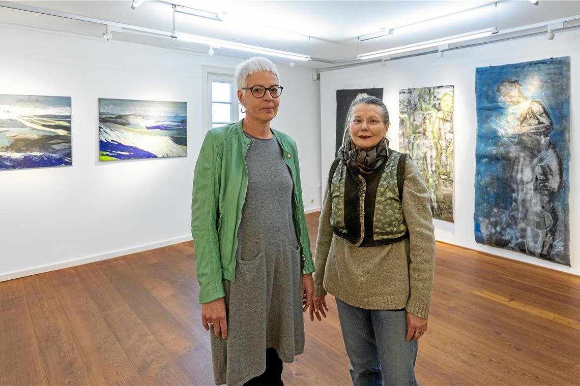 Zwischen den Werken von Carmen Ulrich (links) und Renate Gross (jeweils vor ihren Bildern) gibt es auch viel Verbindendes. Fotos: Alexander Becher