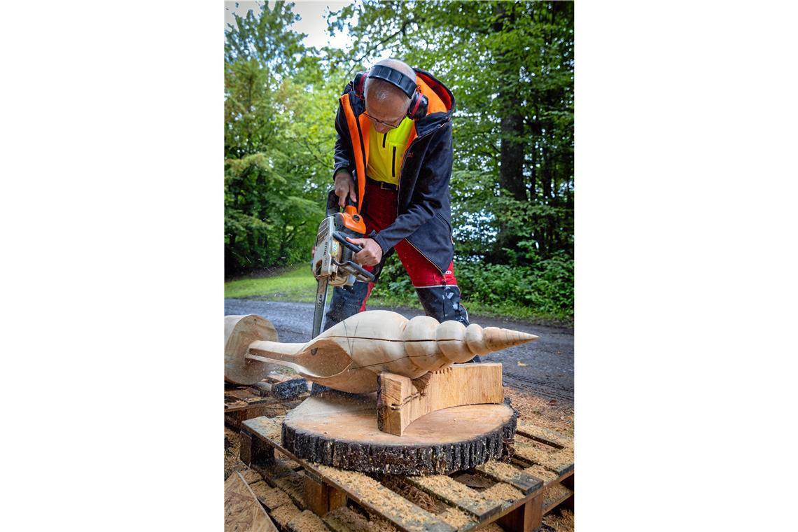 Das systematische Arbeiten liegt ihm als Ingenieur sowieso im Blut, gleichzeitig genießt er aber auch das Kontrastprogramm zum Beruf, das die Holzkunsttage für ihn bedeuten: „Wenn ich etwas mit den Händen forme, kann ich gut abschalten.“ Der ambitionierte Bildhauer hat den ganzen Kofferraum voller Werkzeug, er betreibt sein Hobby seit über zehn Jahren, zeigt seine Arbeiten auf Ausstellungen und verkauft sie auch. Inzwischen hat er so viel Erfahrung, dass er bei filigraneren Skulpturen teilweise nach Gehör sägt: „Man hört es, wenn das Holz kurz davor ist, zu brechen.“ Die Spindelschnecke aus Lindenholz hat er bereits bei den Holzkunsttagen im vergangenen Jahr begonnen. Bis Ende Oktober muss sie fertig sein, dann präsentiert er sie im Rahmen der Kunstausstellung „Arte“ auf Burg Stettenfels.