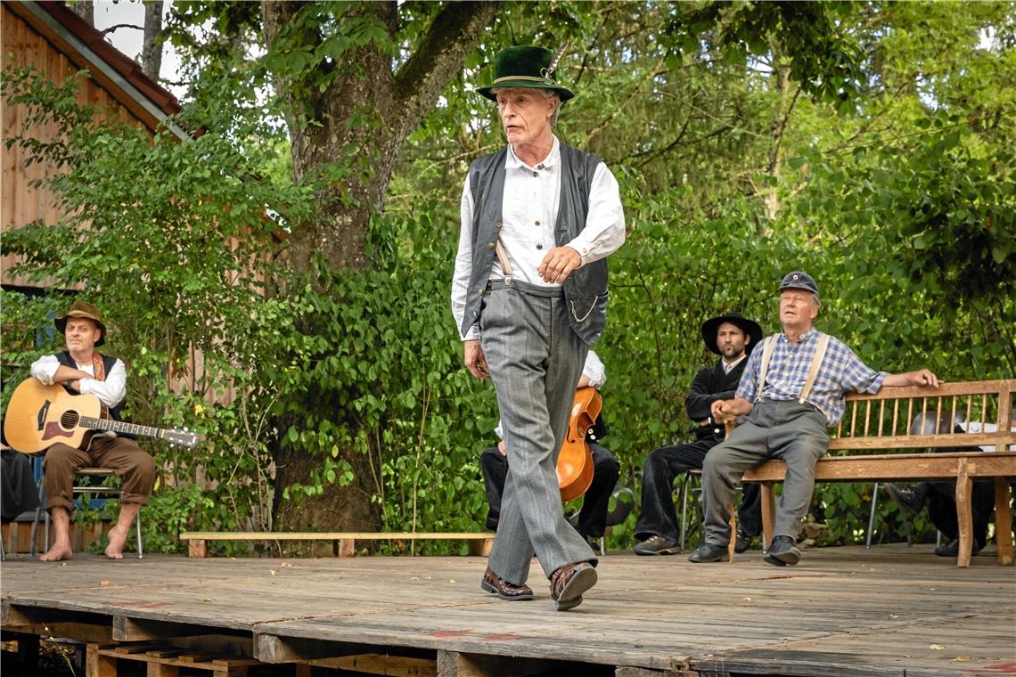 Die Probe beginnt. Dass die goldenen 20er-Jahre keineswegs golden waren, das macht gleich zu Beginn Matze Hesser als armer Bauer klar. Nicht mal Geld für Schuhe oder Strümpfe hat er: „I armer schwäbischer Baur, wie isch mir des Leba saur. Wenn i bloß scho im Himmel wär“, so klagt er sein Leid – während hinter einer Bank der Totengräber (Rolf Butsch) mit der der Martel (Gabi Gruber) schäkert. Doch auch die beiden werden ernst: „Mit wieviel Hoffnung sind wir ins neue Jahrhundert reingegangen?“, fragt die ältere Frau. „Und wie haben wir uns getäuscht“, erwidert der Totengräber Jakob ernüchtert, der, wie so oft in den Stücken des Theaters Rietenau, seine Stimme in Zeiten der Krise mahnend erhebt und auch auf die andere Seite der Medaille hinweist.
