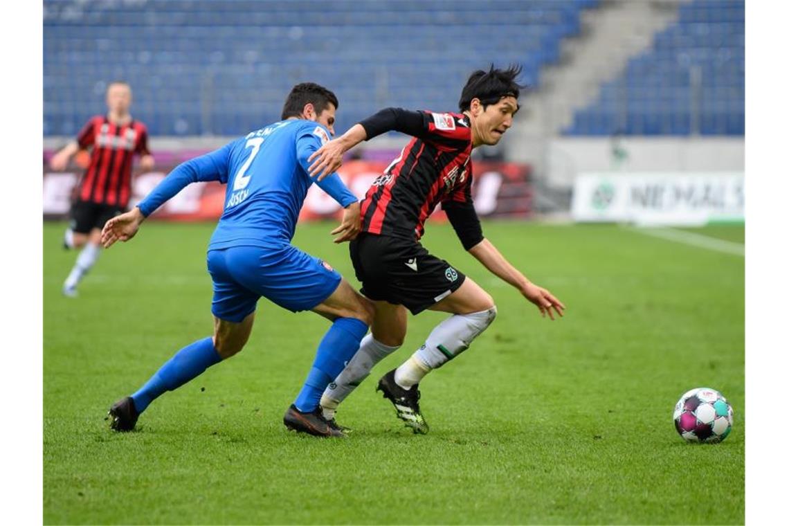 Hannovers Genki Haraguchi (r) spielt gegen Heidenheims Marnon Busch. Foto: Swen Pförtner/dpa