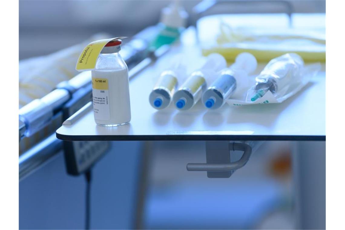 Medikamente zur Behandlung von Covid-19 liegen auf einem Tisch an einem Krankenbett. Foto: Robert Michael/dpa-Zentralbild/dpa/Archivbild