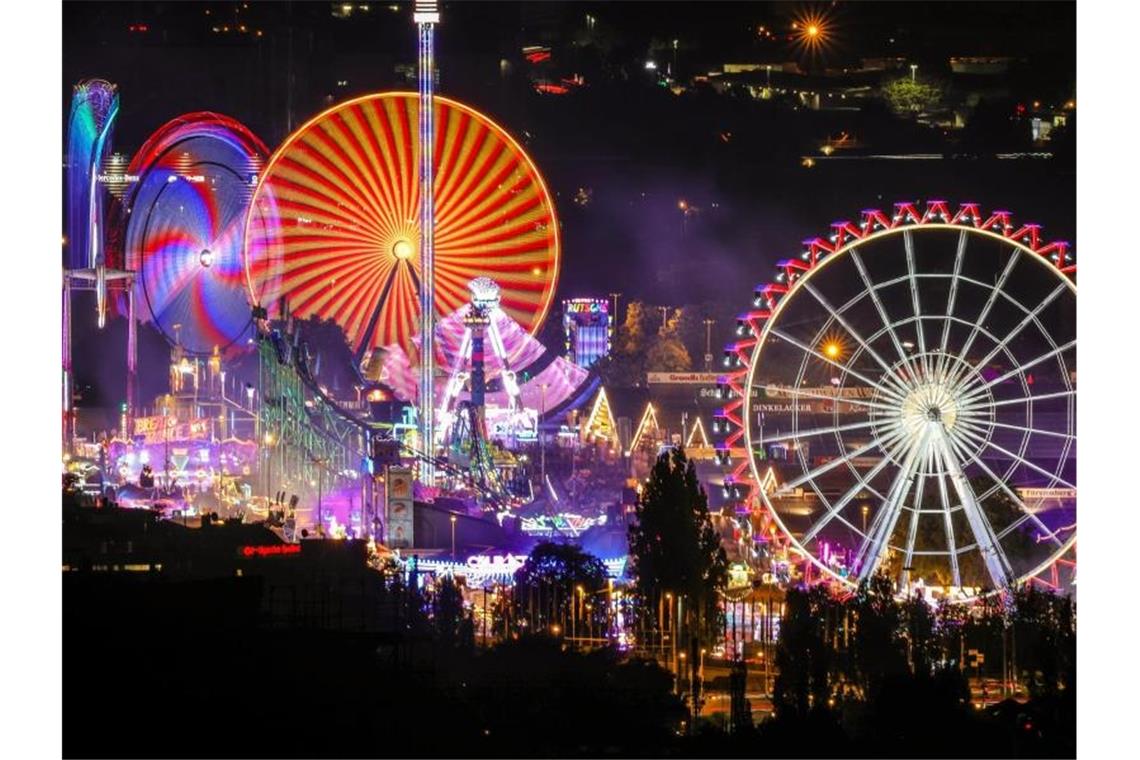 Bunt leuchtende Lichter sind auf dem 174. Cannstatter Volksfest zu sehen. Foto: Christoph Schmidt/dpa
