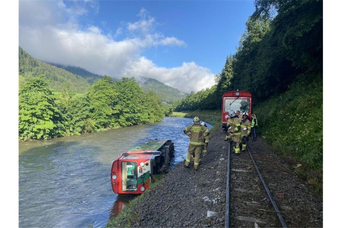 Ein Waggon eines Regionalzugs liegt in der Mur. Foto: -/FREIWILLIGE FEUERWEHR TAMSWEG/APA/dpa