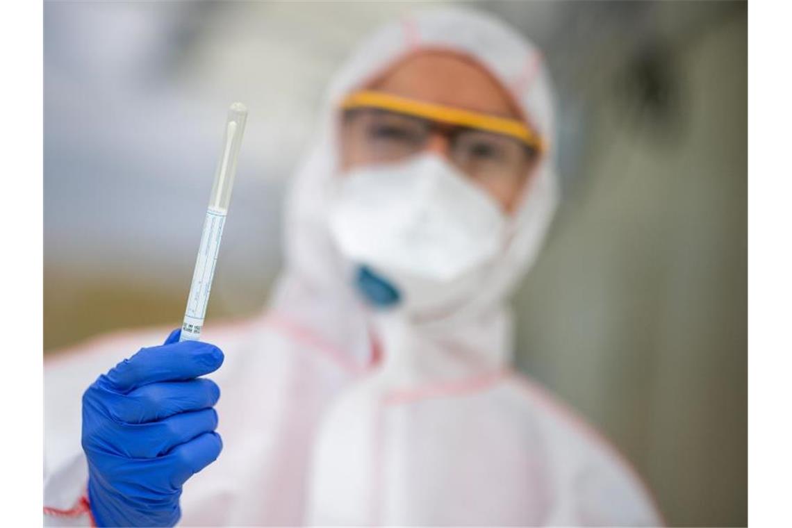 Ein Mitarbeiter hält in einem Abstrichzentrum einen Coronatest-Abstrich in der Hand. Foto: Sebastian Gollnow/dpa/Symbolbild
