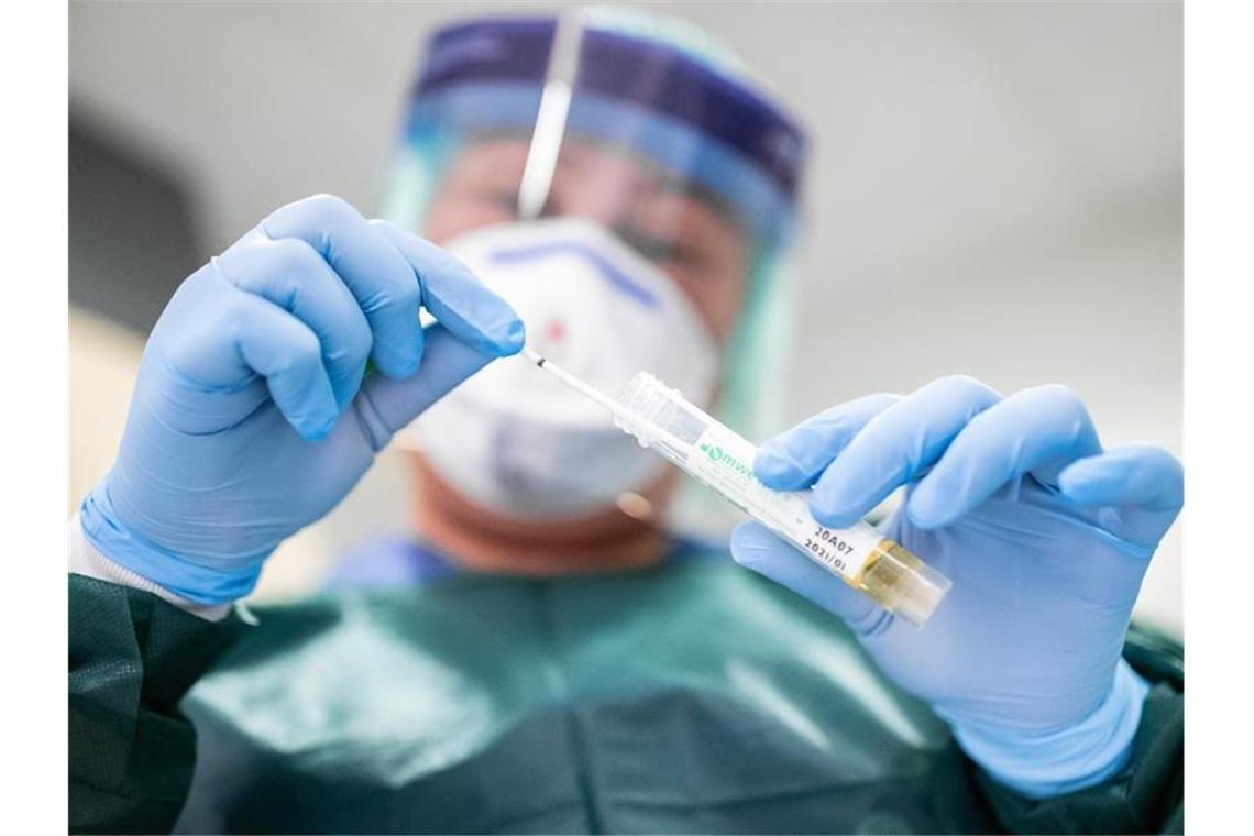 Stationsleiterin in Schutzkleidung und mit einer Atemmaske. Foto: Marcel Kusch/dpa