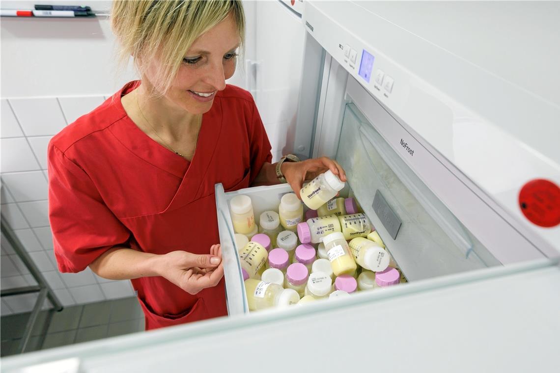 Das Team der Frauenmilchbank kümmert sich um die Vermittlung von Milchspenderinnen, organisiert virologische und bakteriologische Kontrollen und sorgt für die fachgerechte Lagerung und Abgabe der anonymisierten Milchproben. Dank personeller Aufstockung ist nun die regelmäßige Erreichbarkeit und Öffnungszeit der Milchbank auch für externe Spenderinnen gewährleistet. Die Hardware der Frauenmilchbank umfasst fünf neue Tiefkühlschränke, von denen jeder bis zu 70 Liter fasst. Bei minus 32 Grad schlummern die Milchproben dort in der ebenfalls neuen Milchküche auf Station 28 ihrer Verwendung entgegen.