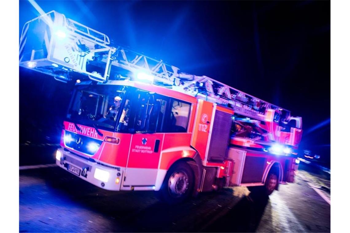 Ein Drehleiterwagen der Feuerwehr fährt mit Blaulicht an einer Unfallstelle vorbei. Foto: Marcel Kusch/dpa/Illustration