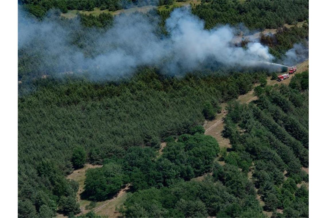 In einem Waldstück bei Jüterbog (Brandenburg) bekämpfen Feuerwehrleute einen Waldbrand. Foto: Paul Zinken/dpa-Zentralbild/dpa