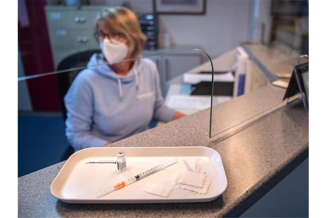 Eine Spritze mit dem Impfstoff von Biontech/Pfizer am Empfang einer Arztpraxis. Foto: Sina Schuldt/dpa