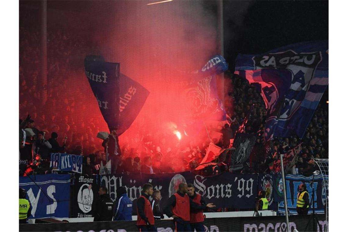 Karlsruher Fans brennen Pyrofackeln ab. Foto: Uli Deck/dpa/Archivbild