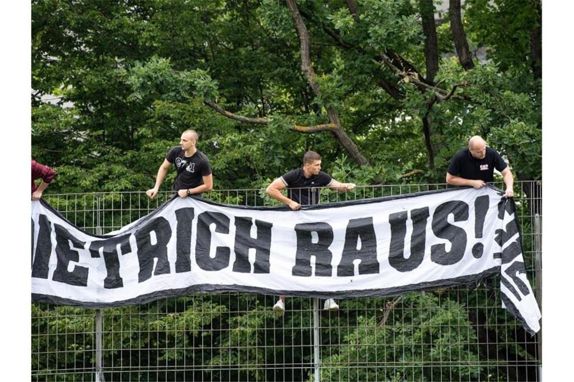 Stuttgarter Fans hängen im Robert-Schlienz-Stadion ein Transparent mit der Aufschrift "Dietrich raus!" auf. Foto: Wolfgang Dietrich/Archiv