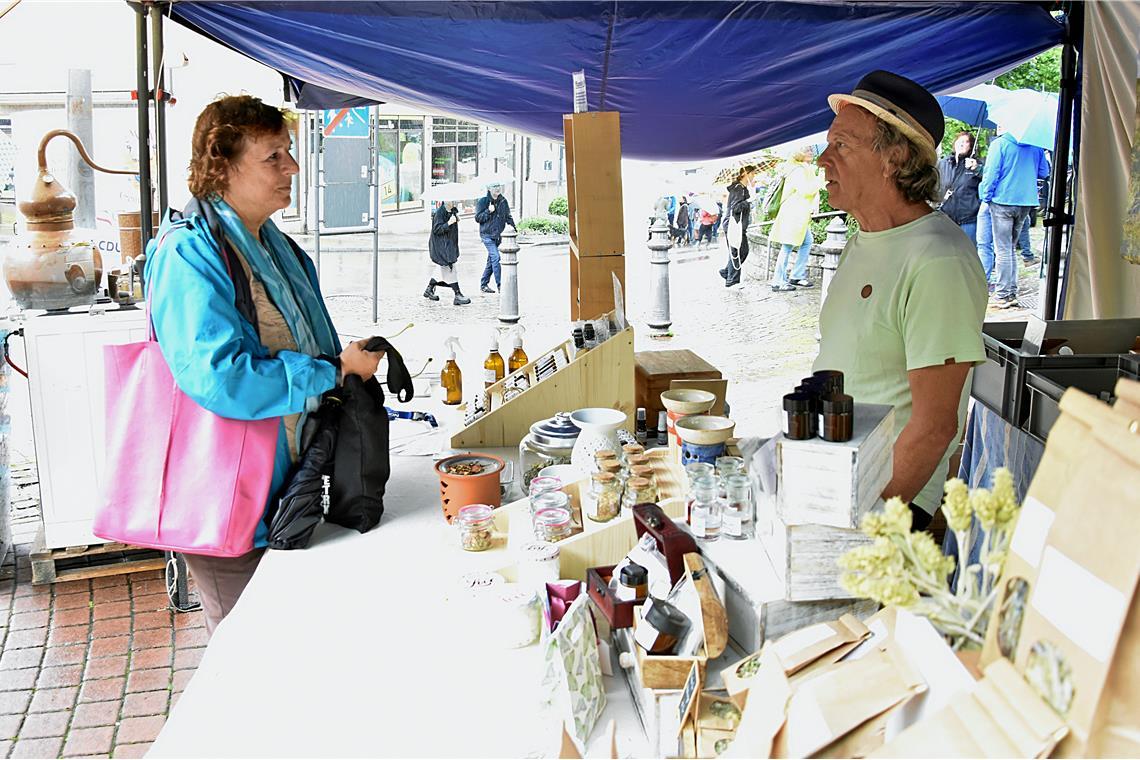 Stammkunden Bei Gerd Ihle aus Murrhardt, der seine Chili- und Grillsaucen, Senf und Gewürzmischungen bis hin zu Chilisalz anbietet, sind es vor allem die Stammkunden, die sich nicht vom Wetter aus der Ruhe bringen lassen und die den Weg an den Stand finden. Unterstützt von seiner Frau Kirstin Krack werden heimlich nebenbei die schönsten Regenschirme prämiert. Regenbogenfarben stehen hoch im Kurs.