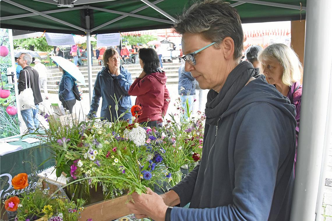 Regio-Streunerle Tanja Fichtl und Werner Wallenwein von der Imkerei Fichtl aus Auenwald-Oberbrüden präsentieren beim Regio-Streunerle einige ihrer Produkte – beispielsweise frischen, ungerührten Blütenhonig sowie eine Mandel-Kakao- und Früchte-Gewürz-Variante. Susanne Kieser hat noch im Regen auf ihren Ackerflächen in der Umgebung von Weissach im Tal, Allmersbach im Tal und Backnang frische Blumen für Sträußchen gepflückt, obwohl Teile unter Wasser standen. Sie möchte die Vielfalt der heimischen Blumen zeigen, die eine wunderbare Alternative zu weit gereisten darstellen. Diese Bewegung, für die sie sich im Rahmen des Mostviertels engagiert, hat mittlerweile einen Namen: Slowflower.
