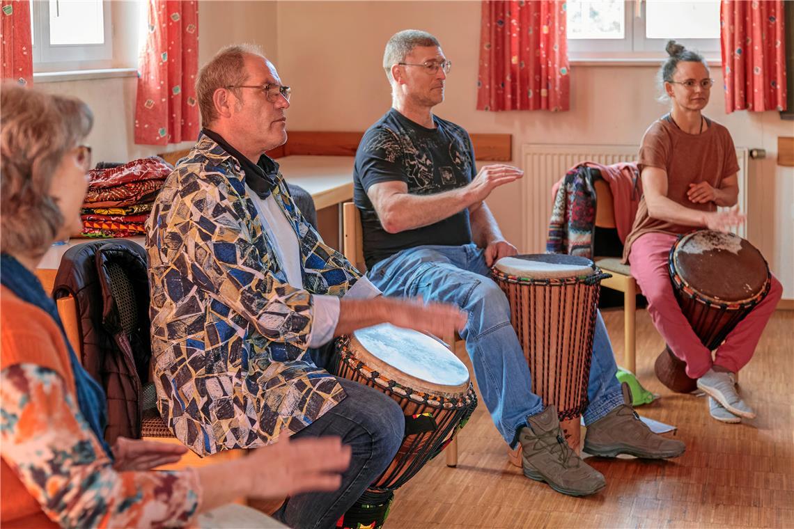 Harald Hanne (Zweiter von links) leitet aktuell einen Kurs im afrikanischen Trommeln in der Pfarrscheuer in Murrhardt. Foto: Stefan Bossow