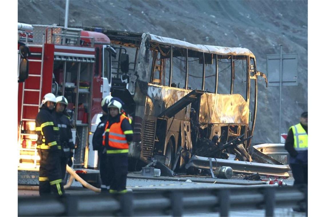 Rettungskräfte der Feuerwehr an der Unfallstelle neben dem ausgebrannten Bus. Bei dem Unglück im Westen Bulgariens starben mindestens 46 Menschen. Foto: Minko Chernev/BTA Agency Bulgaria/AP/dpa