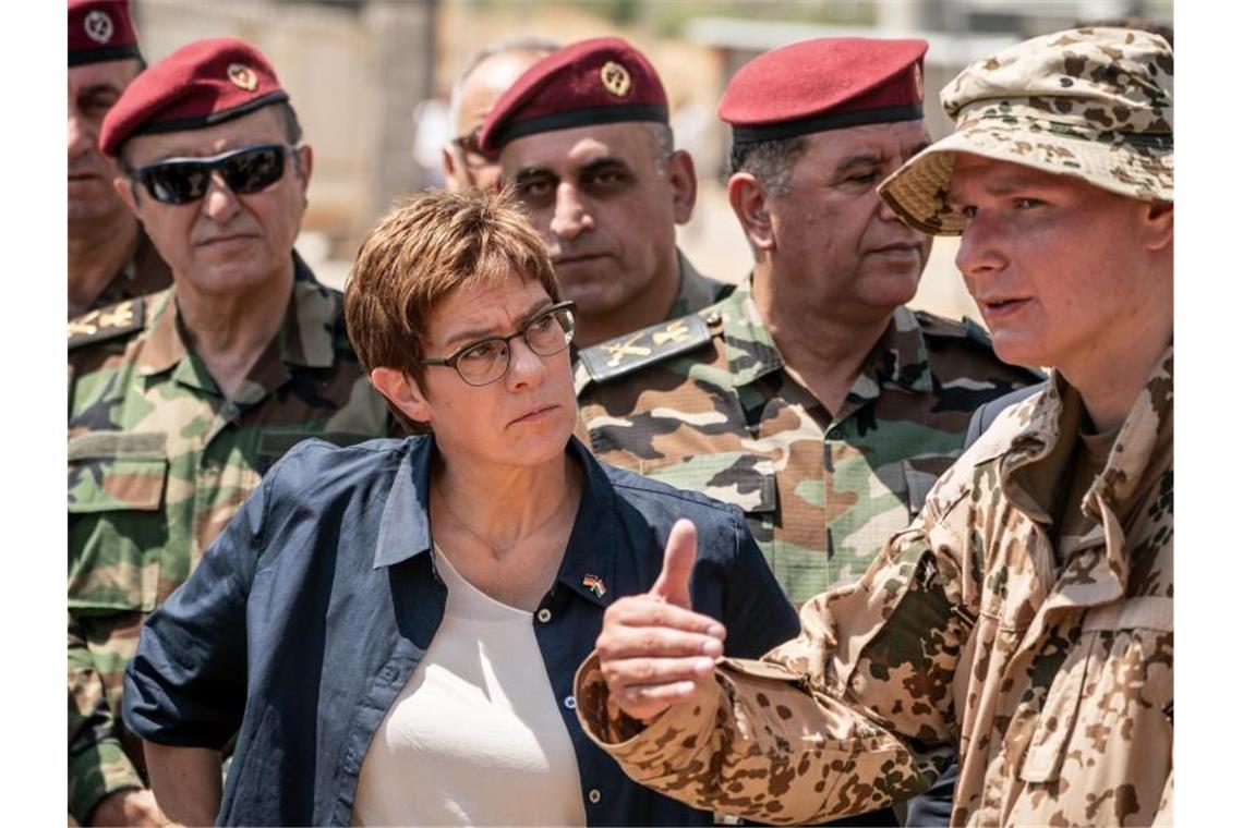 Irak-Besuch: Verteidigungsministerin Annegret Kramp-Karrenbauer spricht in Bnaslawa mit einem Soldaten der Bundeswehr, der die Ausbildung kurdischer Peschmerga im nordirakischen Kurdengebiet unterstüzt. Foto: Michael Kappeler/dpa
