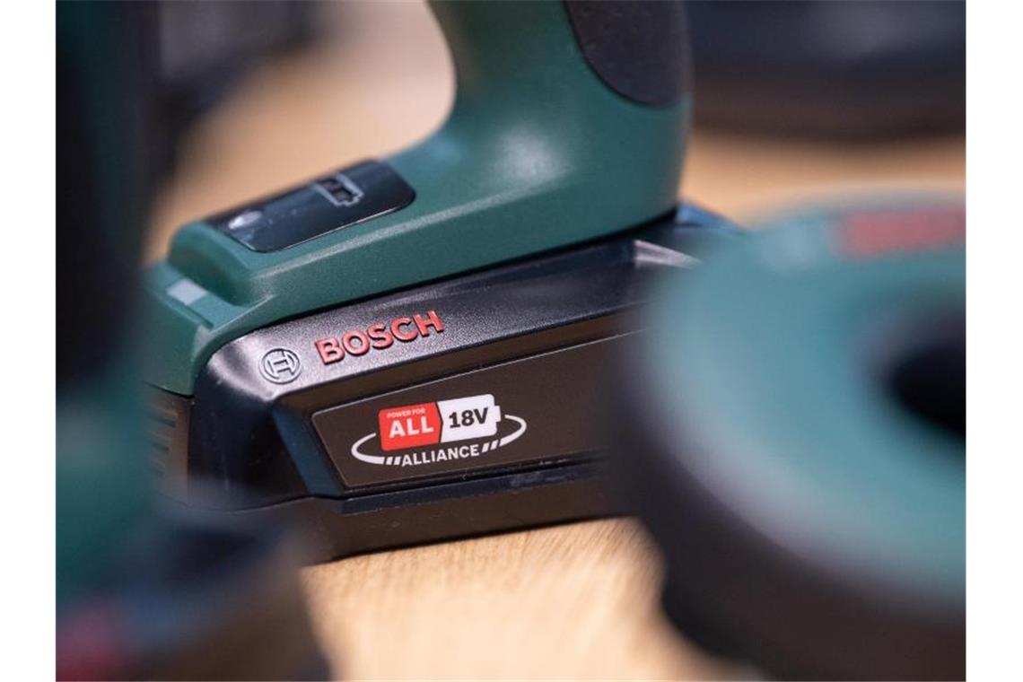 Ein Akku mit dem Label „Power for all 18 V Alliance“ von Bosch steckt an einem Bohrer der Firma. Foto: Sebastian Gollnow/dpa