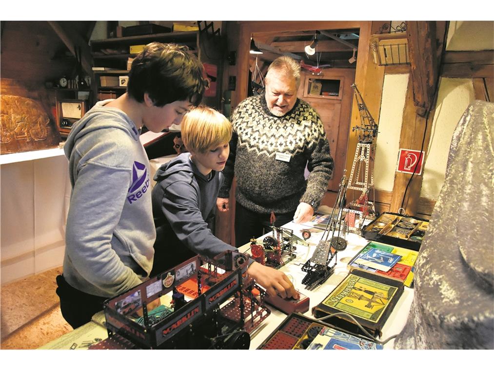 Reminiszenz an die eigene Kindheit und Jugend: Ben (links, 13 Jahre) und Benni (14 Jahre) sind begeistert von den Metallbaukästen, mit denen ihre Eltern und Großeltern spielten. Sie testen den Märklin-Drehzahlmesser. Jochen Elzmann, Vorsitzender des Historischen Vereins Burgstetten, erklärt den beiden Ausstellungsbesuchern das Metallspielzeug. Foto: T. Sellmaier
