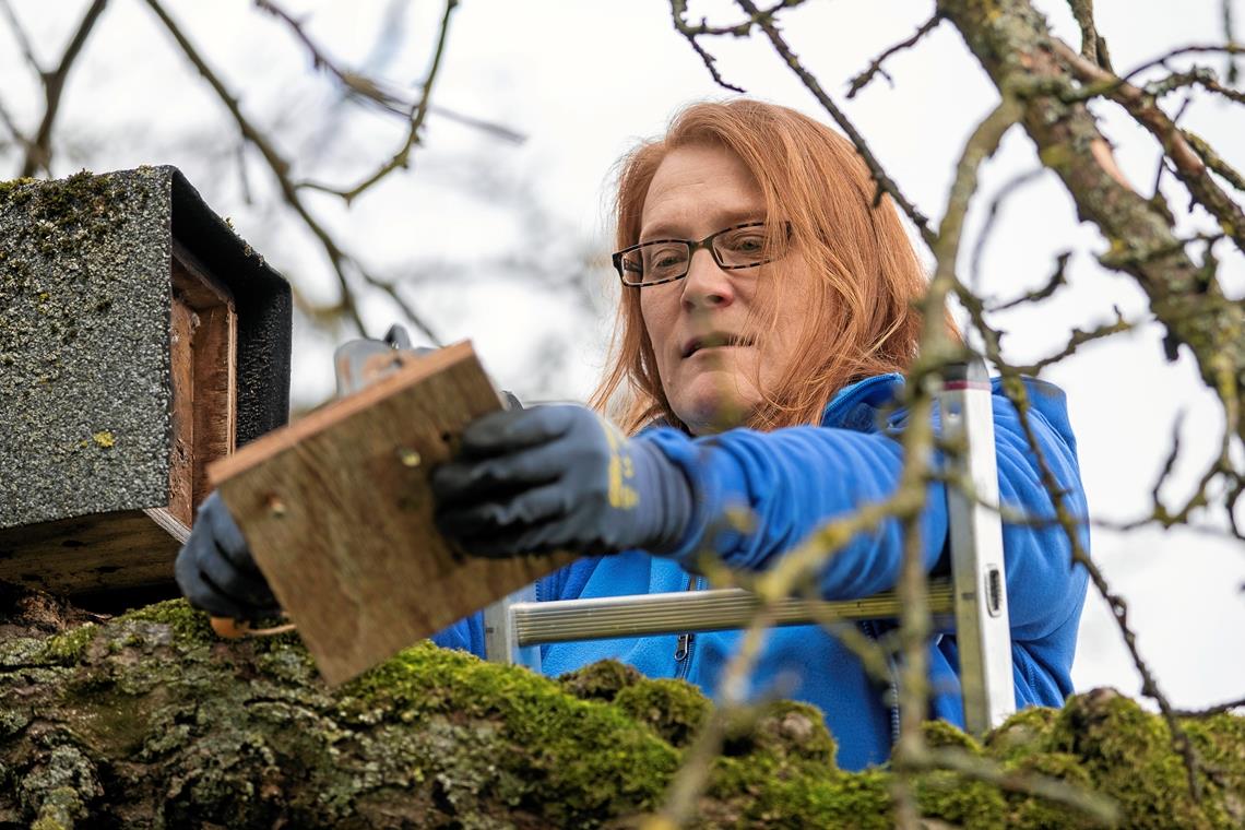 Anja McGrath inspiziert und reinigt Steinkauzröhren bei Backnang-Waldrems. Foto: A. Becher