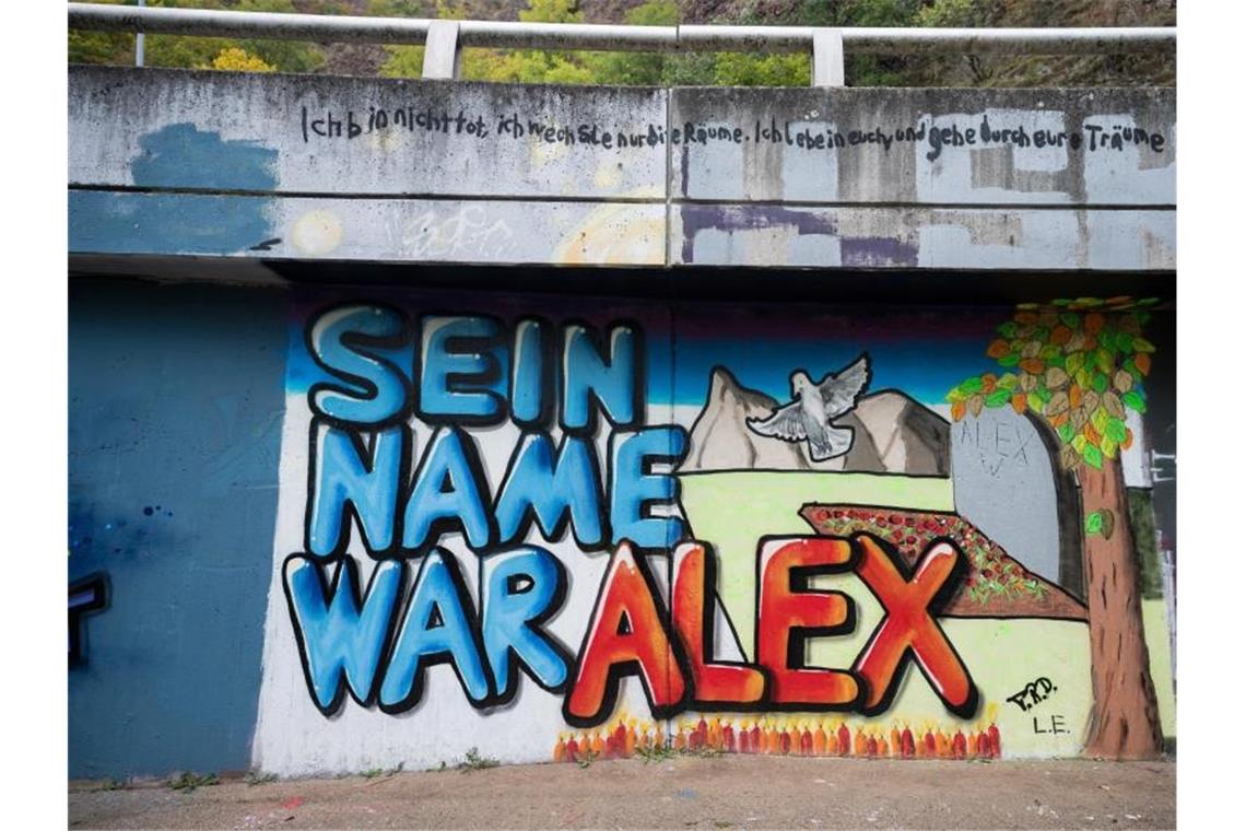 Auf einer Mauer ist ein Graffiti "Sein Name war Alex" für getöteten Tankstellen-Mitarbeiter gesprüht. Foto: Oliver Dietze/dpa