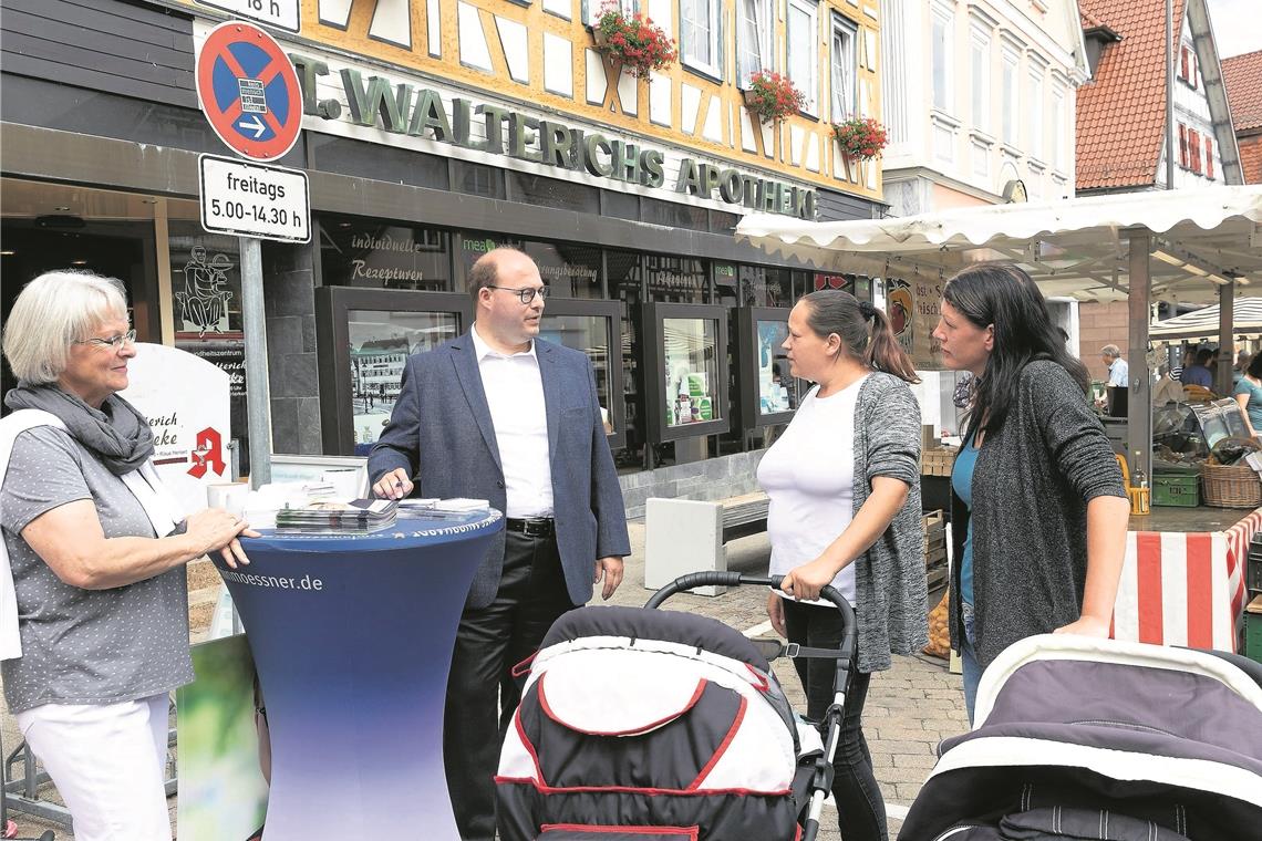 Armin Mößner (Zweiter von links) mit seiner Mutter Doris Härer (links) am Wahlinfostand. Der Murrhardter Wochenmarkt ist eine gute Gelegenheit, mit Leuten unkompliziert und niederschwellig ins Gespräch zu kommen. Die Themen und Anliegen sind breit gestreut. Foto: J. Fiedler