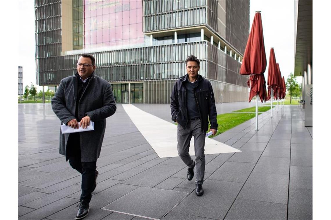 Tekin Nasikkol, Gesamtbetriebsratsvorsitzender der Stahlsparte von Thyssenkrupp und Oliver Burkhard, Vorstand Personal und Arbeitsdirektor der Thyssenkrupp AG. Foto: Guido Kirchner