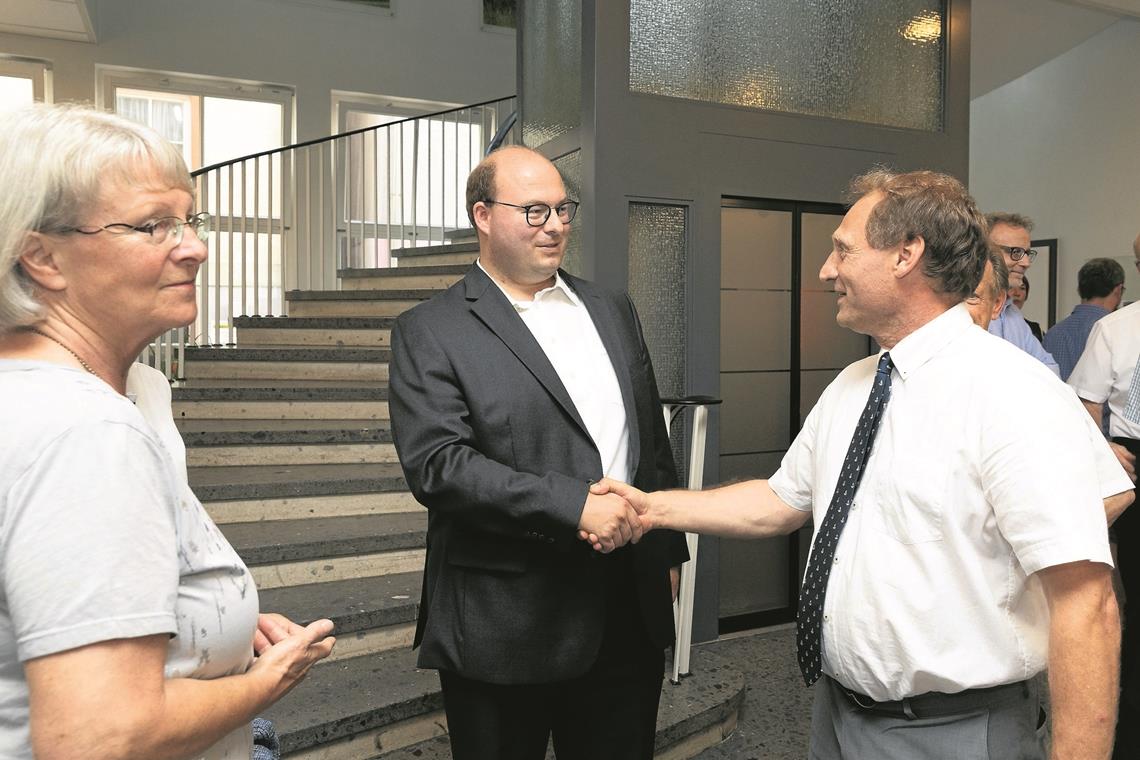 Nach und nach zeichnet sich ab, dass Armin Mößner in so gut wie allen Wahlbezirken die über 80 Prozent halten kann. Einziger Ausreißer ist das Wahllokal im Gymnasium mit rund 76 Prozent, Spitzenreiter ist Kirchenkirnberg mit rund 87 Prozent. Armin Mößner lächelt und stellt fest: „Da hatte ich 2011 mein schlechtestes Ergebnis.“ Ein Murrhardter, der etwa zur Halbzeit der auszuzählenden zwölf Bezirke eintrifft, sagt mit einem Schmunzeln: „Da ist ja heute gar keine Spannung drin.“ Ein anderer meint, dass sich Armin Mößner jetzt getrost zurücklehnen könne und schiebt noch hinterher, „na sagen wir, jetzt können Sie richtig durchstarten“. Gegen 18.40 Uhr gehen die ersten Gratulanten auf Armin Mößner zu, Althüttes Bürgermeister Reinhold Sczuka hat seinem Kollegen einen edlen Tropfen mitgebracht, Spiegelbergs Bürgermeister Uwe Bossert wünscht Mößner alles Gute für die kommende Arbeit, genauso wie Staatssekretär Wilfried Klenk mit seiner Frau.