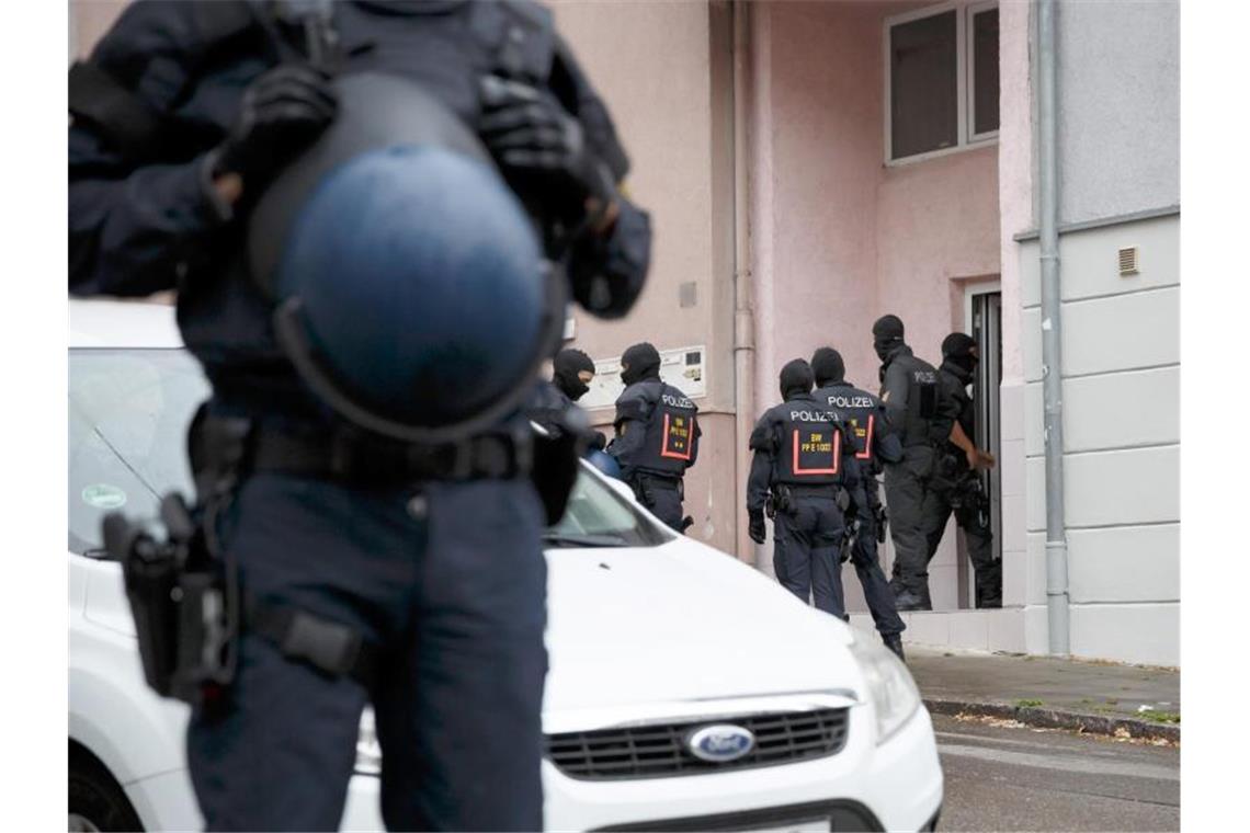 Polizisten bei einer Razzia im Zusammenhang mit der Attacke auf einen Teilnehmer einer Corona-Demo. Foto: Julian Rettig/dpa