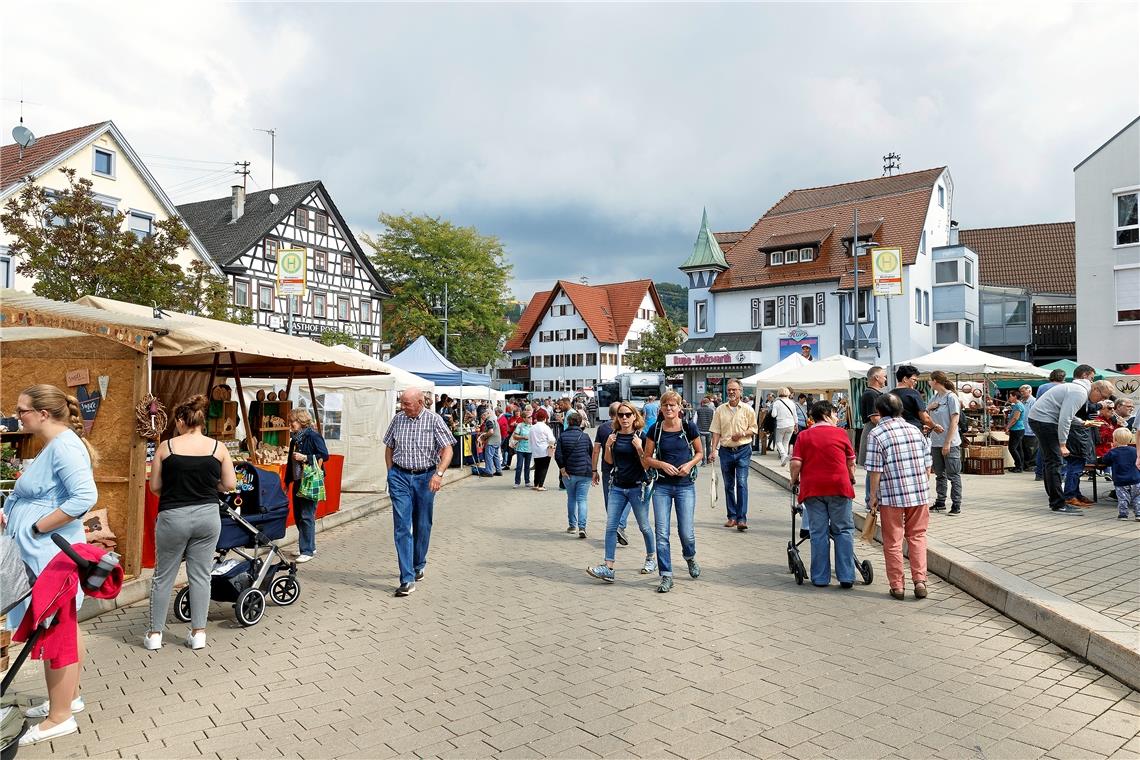 Hochbetrieb auf dem Rathausplatz in Sulzbach an der Murr. Viele Besucher bummeln an den Ständen entlang und bewundern das Angebot an regionalen Artikeln. Foto: Jörg Fiedler