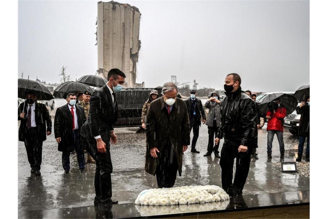 UN-Generalsekretär Antonio Guterres legt einen Kranz am Ort der Explosion im Hafen von Beirut nieder. Bei der Detonation waren im vergangenen Jahr mehr als 190 Menschen gestorben. Foto: Marwan Naamani/dpa