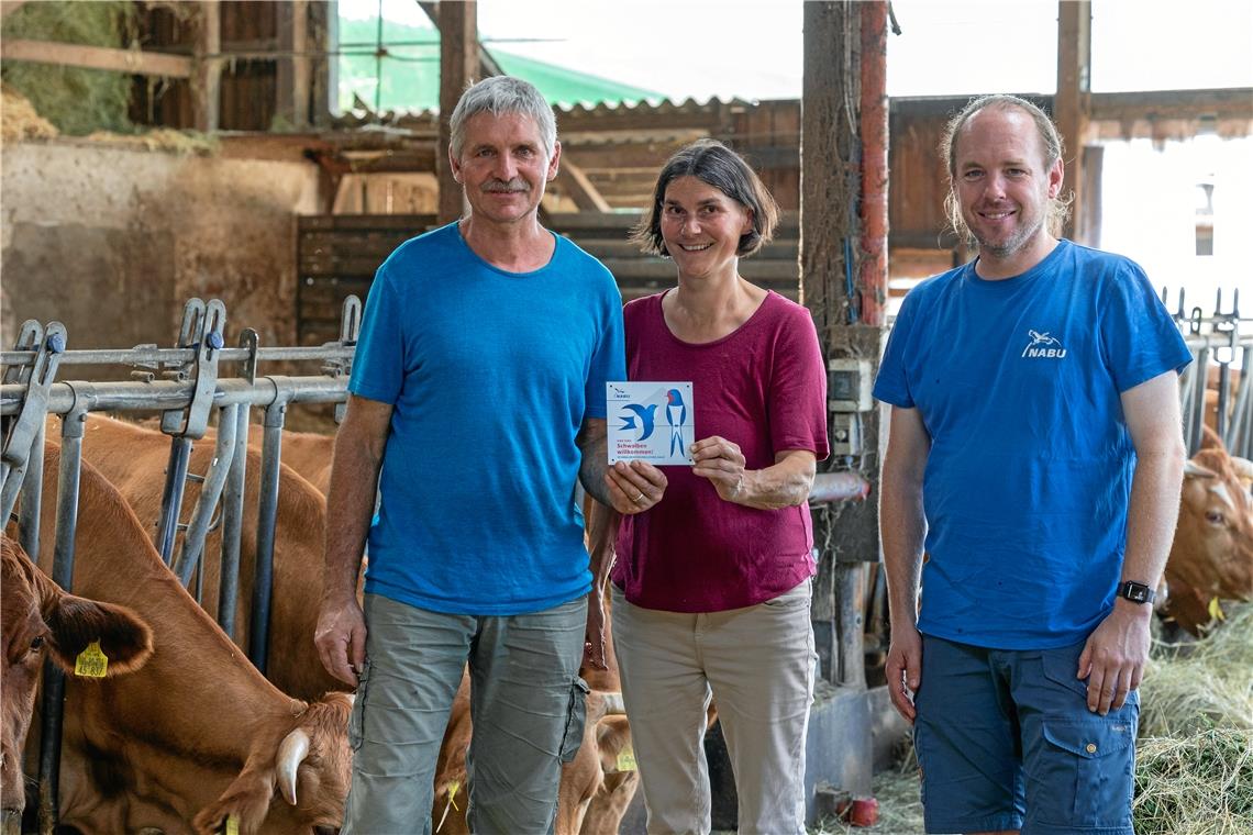 Der Hof von Helmut Voltz (links) und Beate Häußermann-Voltz ist vom Nabu, vertreten durch Jochen Schäufele, als schwalbenfreundliches Haus ausgezeichnet worden.