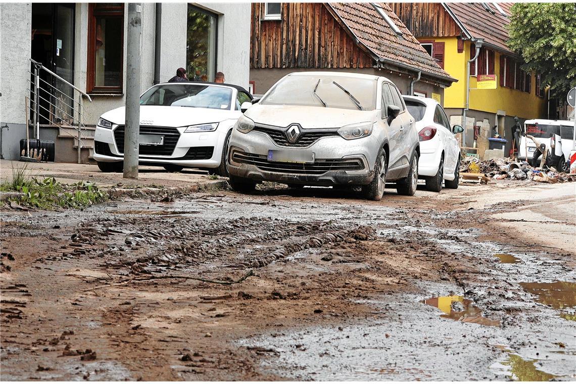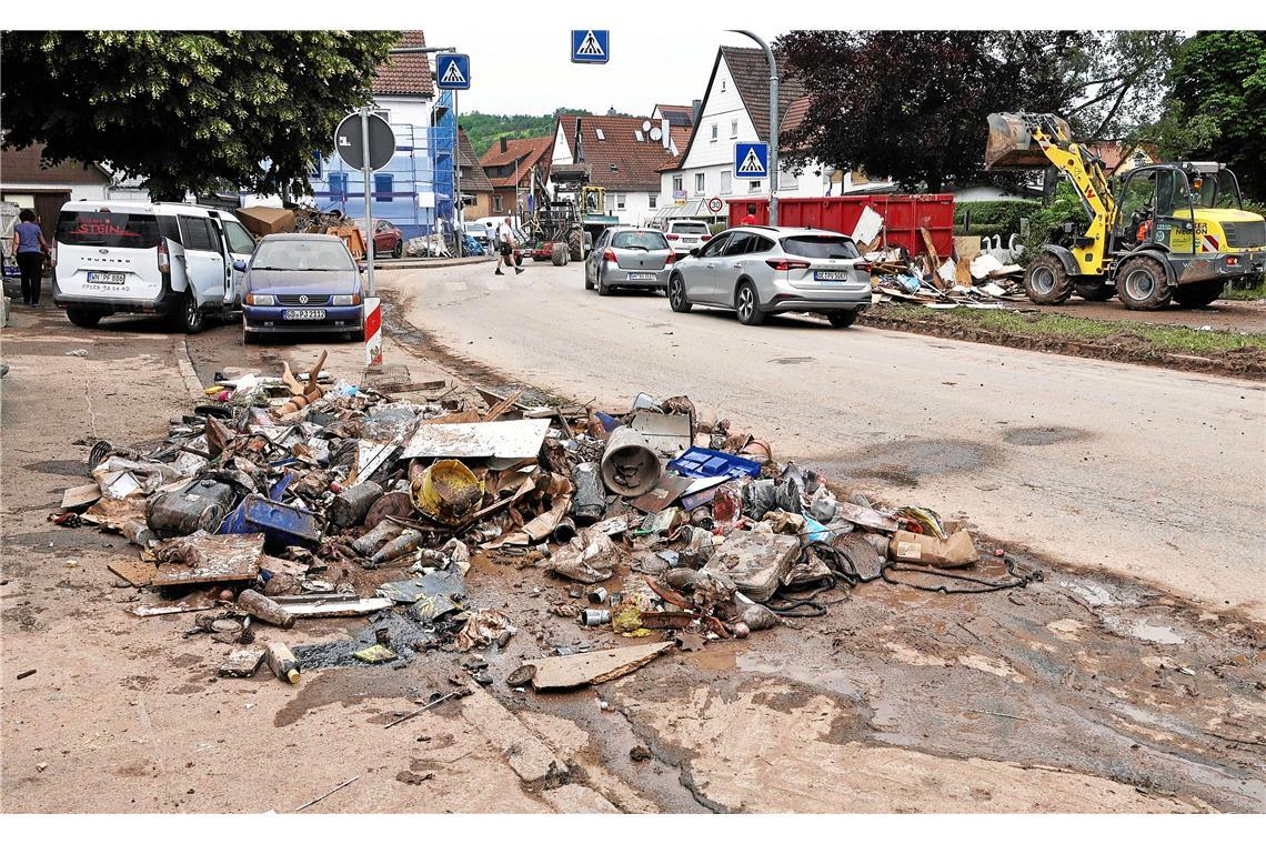 Im Hochwassergebiet Ruderesberg gibt es alle Hände voll zu tun. Die Aufräumarbeiten nach dem Starkregen sind in vollem Gange.