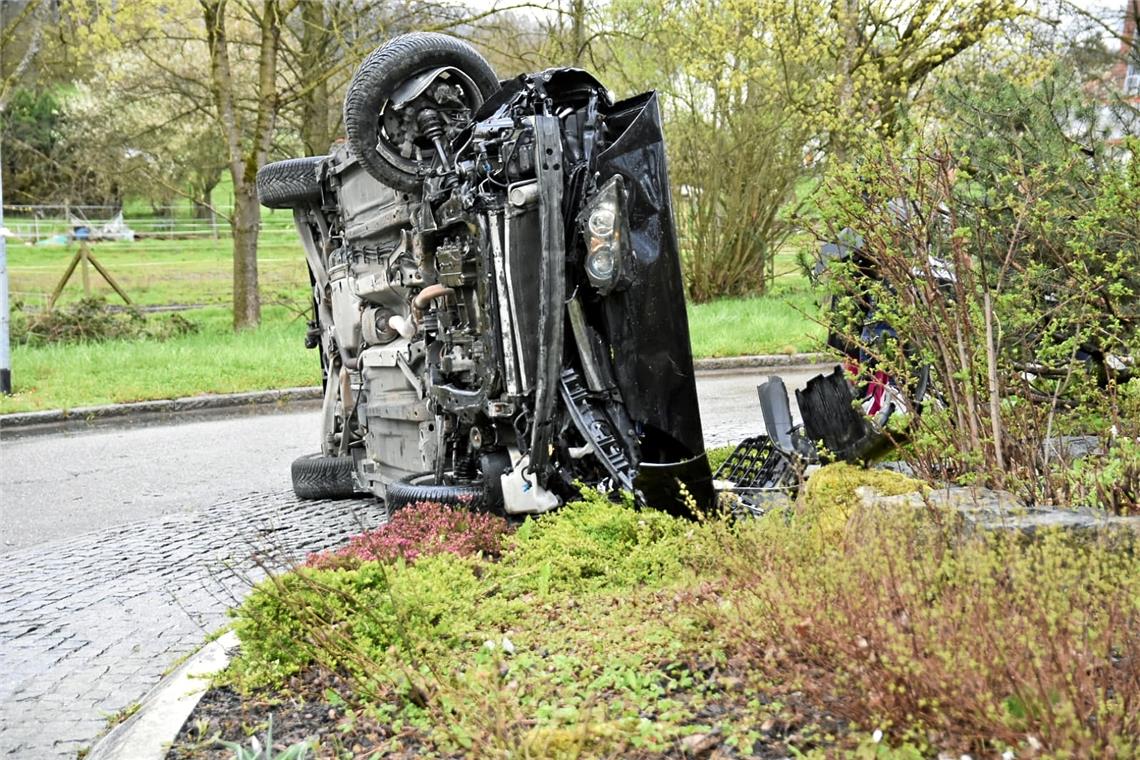 Ein Auto liegt nach einem Unfall an einem Kreisverkehr in Steinbach auf der Seite. Foto: Tobias Sellmaier