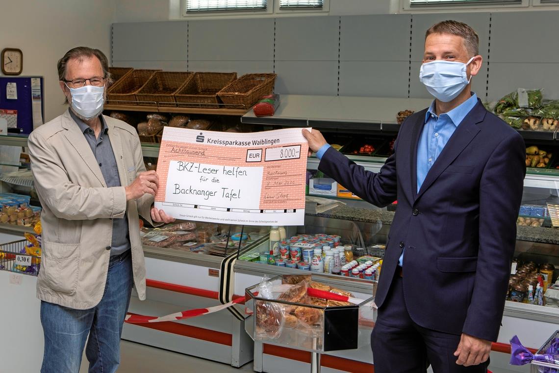 Mit Mundschutz und dem größtmöglichen Abstand nahm Heinz Franke (links) in der Backnanger Tafel den symbolischen Spendenscheck von Redaktionsleiter Kornelius Fritz entgegen. Foto: A. Becher