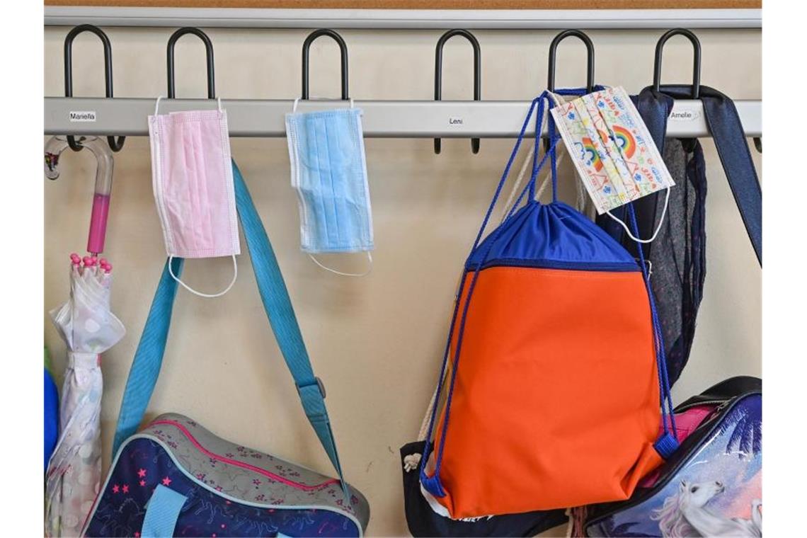 Masken und Taschen hängen in einer Grundschule an Kleiderhaken. Foto: Patrick Pleul/dpa-Zentralbild/dpa/Symbolbild