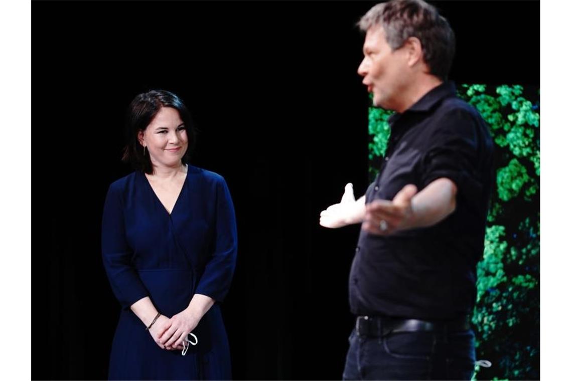 Robert Habeck überlässt die Bühne seiner Co-Vorsitzenden Annalena Baerbock: Sie soll die Grünen als Spitzenkandidatin in die Bundestagswahl führen. Foto: Kay Nietfeld/dpa