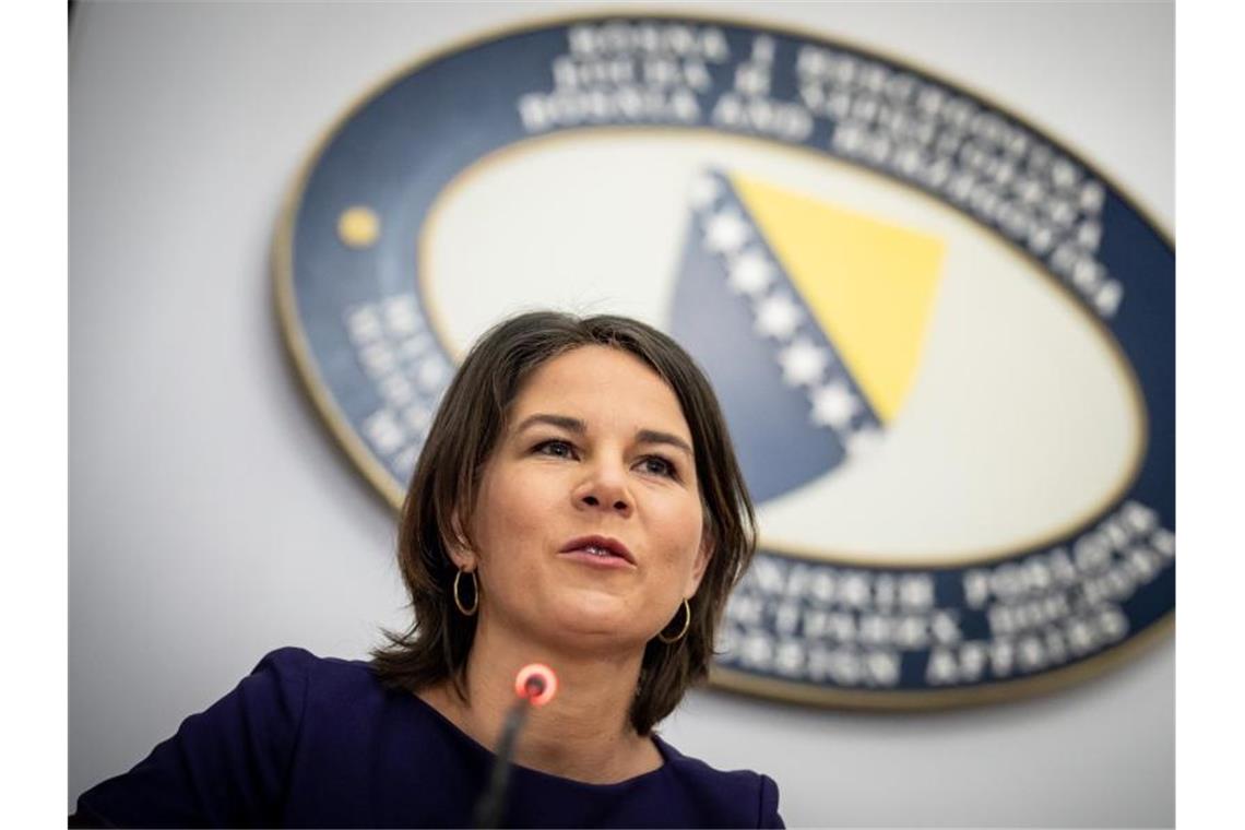 Außenministerin Annalena Baerbock bei einer Pressekonferenz in Sarajevo. Foto: Michael Kappeler/dpa