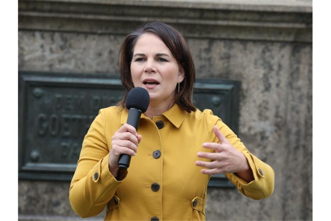 Annalena Baerbock, Kanzlerkandidatin und Bundesvorsitzende von Bündnis 90/Die Grünen, spricht beim Wahlkampf der Grünen in Thüringen auf dem Theaterplatz. Foto: Bodo Schackow/dpa-Zentralbild/dpa