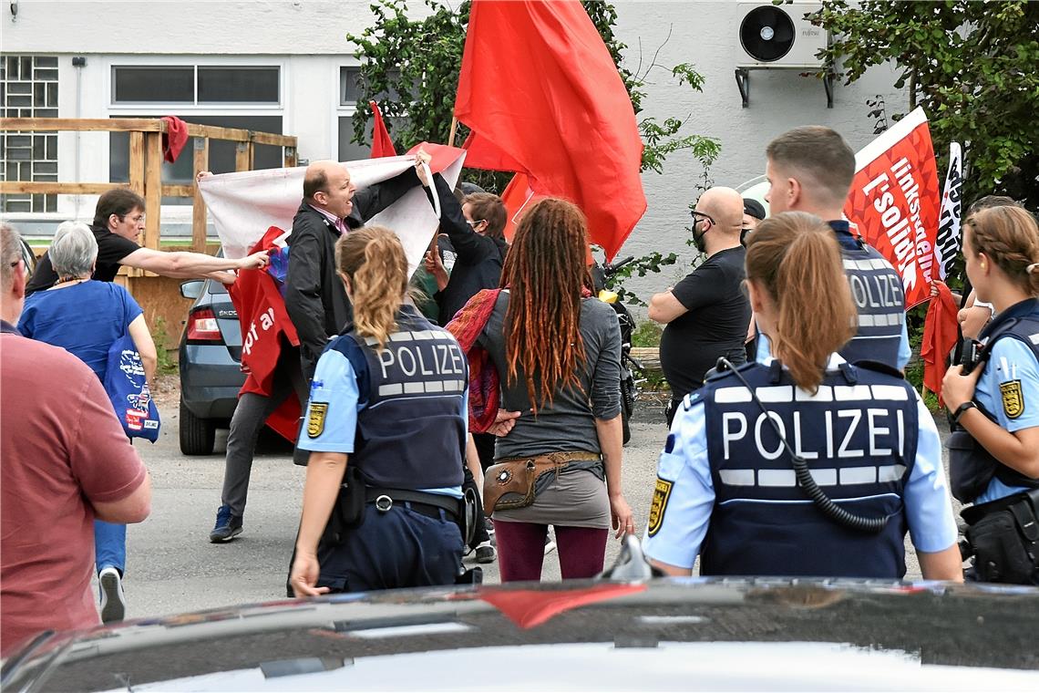 Als die erste Abteilung um die Ecke bog, marschierte sie – Banner voraus – direkt auf eine kleine Gruppe AfD-Leute zu, die sich dort trotz der Absage der Veranstaltung eingefunden und in der Mitte des Parkplatzes aufgestellt hatte. Die Fronten trafen aufeinander, keine Seite gab nach. Einen Moment lang schien die Situation zu eskalieren, dann rückten die Beamten vor und trennten die Ringenden. Die Polizei sei zu spät eingeschritten, beschwerte sich die AfD-Seite anschließend. „Eine gegenseitige Provokation“, beurteilte Einsatzleiter Maier im Nachhinein die Lage: Viel passiert wäre seiner Einschätzung nach auch ohne das Eingreifen der Polizei nicht. Genau das war aber die Sorge von Wirt Edgar Weiher, dass es zu Ausschreitungen kommen könnte.