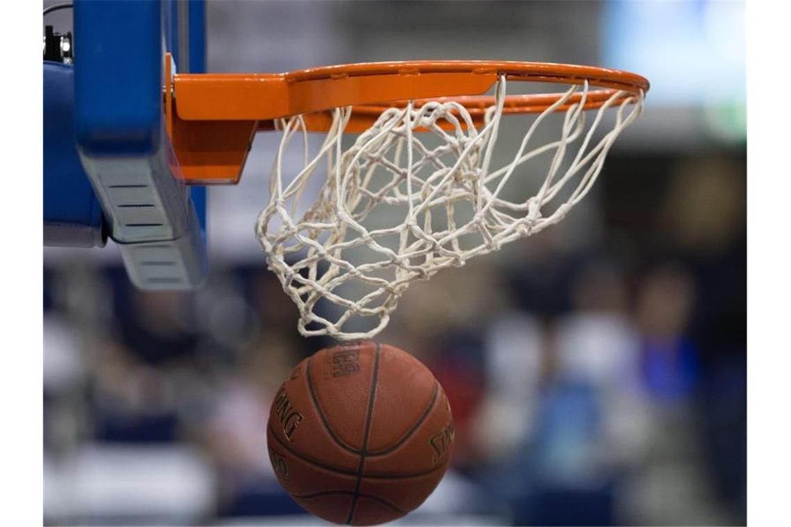 Ein Basketball fällt durch das Netz vom Basketballkorb. Foto: Lukas Schulze/dpa/Archiv/Symbolbild