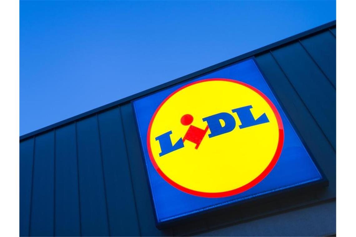 Das Logo eines Lidl-Supermarktes in Berlin-Reinickendorf leuchtet vor dem Abendhimmel. Foto: Matthias Balk/Archivbild