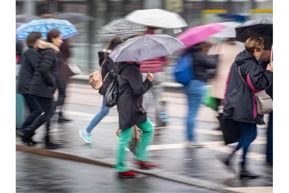 Bei Regenwetter überqueren Passanten eine Straße. F. Foto: Frank Rumpenhorst/dpa