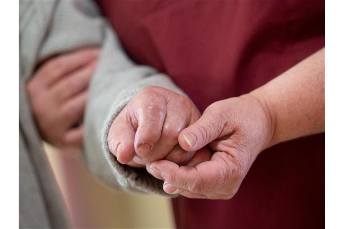 Eine Mitarbeiterin (r) des Seniorenhaus im Vorbachtal, betreut einen Bewohner des privaten Pflegeheims. Foto: Marijan Murat/dpa/Archivbild