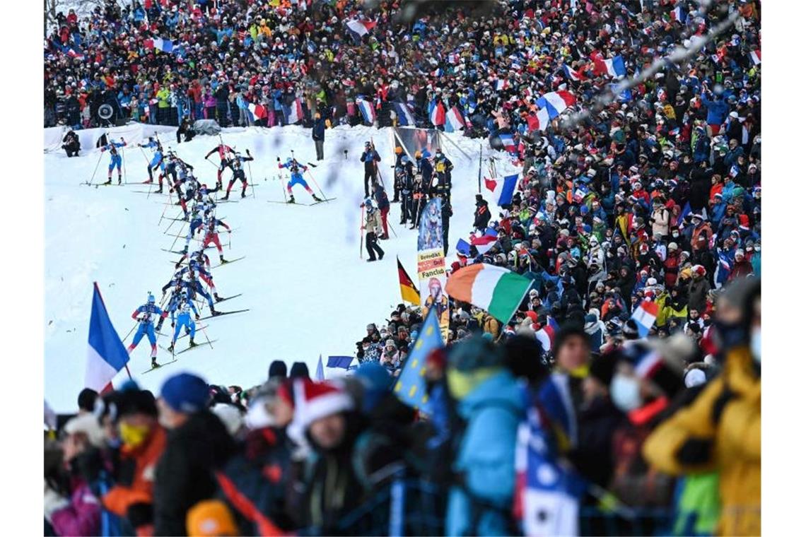 Die Athleten sind in Aktion auf der Strecke, während die Fans dicht gedrängt stehen und zuschauen. Foto: Olivier Chassignole/AFP/dpa/Bildarchiv