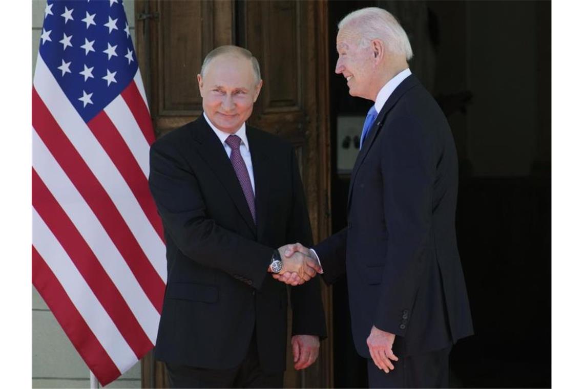 Der russische Präsident Wladimir Putin (l) und US-Präsident Joe Biden schütteln sich die Hände bei ihrem Treffen in der "Villa la Grange". Foto: Alexander Zemlianichenko/AP Pool/dpa