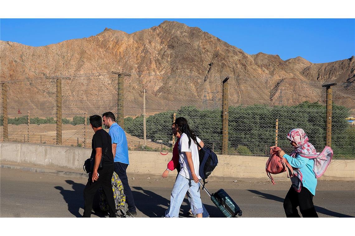 Menschen, hauptsächlich Iraner, die das Land aufgrund der israelischen Angriffe auf den Iran verlassen haben, gehen mit leichtem Gepäck am Grenzübergang an der armenisch-iranischen Grenze in der Nähe des Dorfes Agarak in der Gemeinde Meghri in der Provinz Syunik im Süden Armeniens.